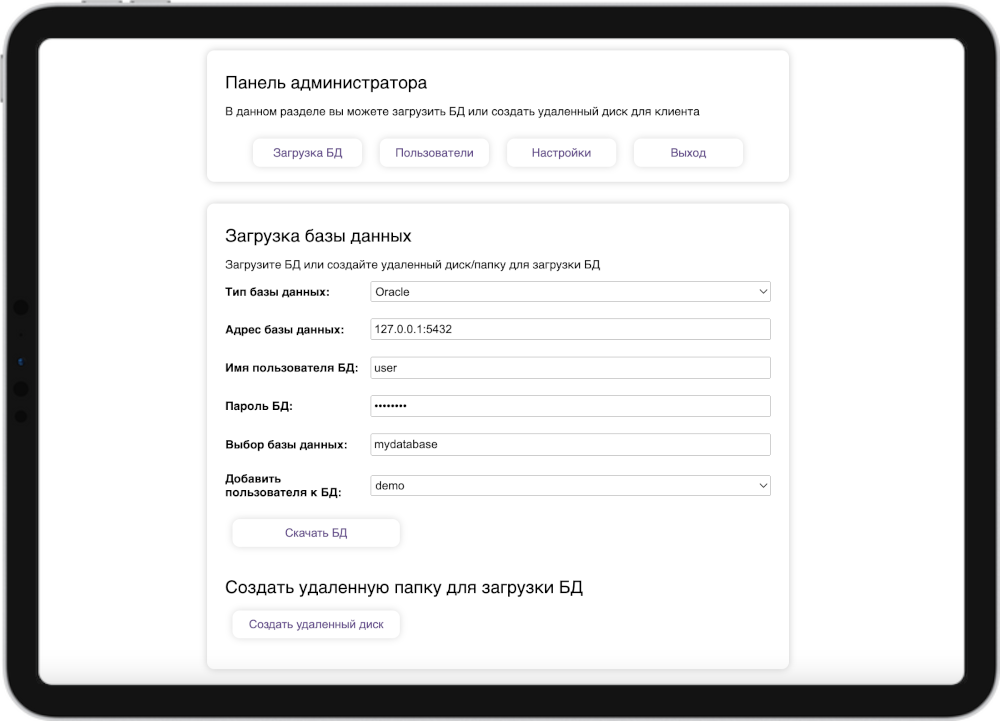 На этой странице администратор может загрузить базу данных или создать удаленную папку для загрузки БД. Поля формы включают: