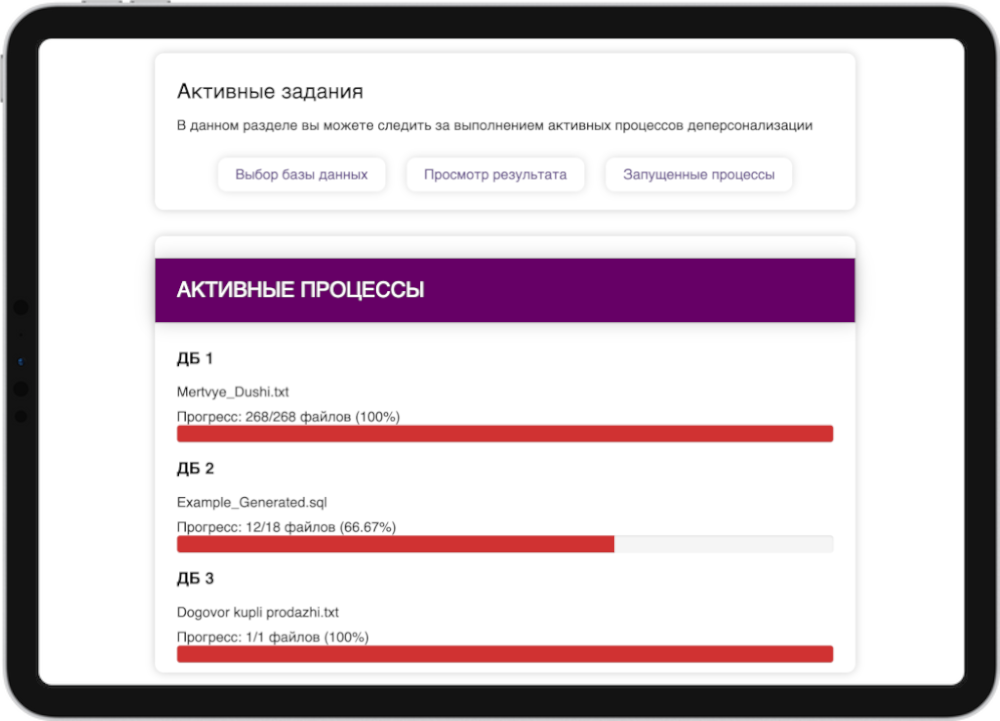 На странице с прогрессом вы можете следить за выполнением активных процессов деперсонализации. В данном разделе отображается информация о текущем статусе обработки каждого задания.