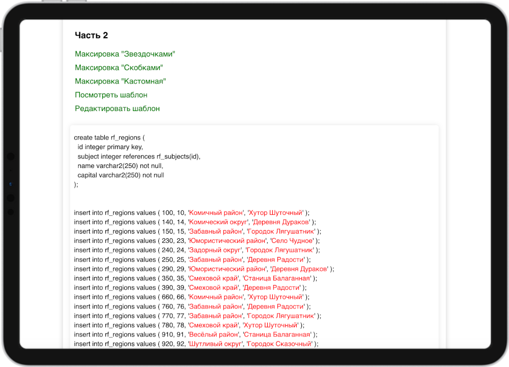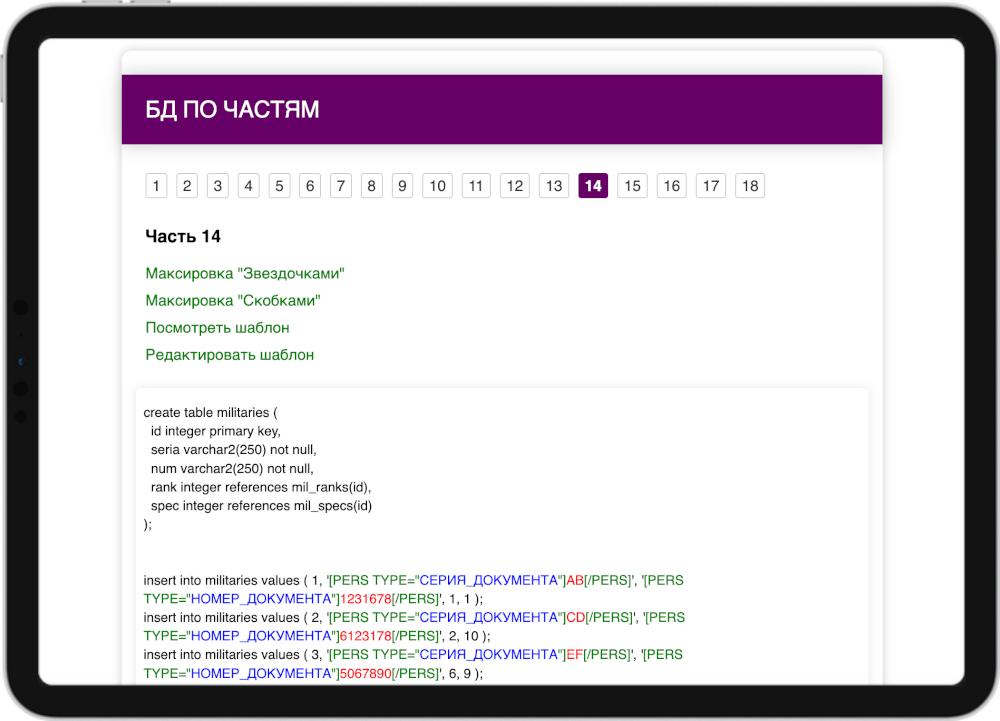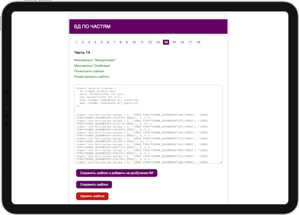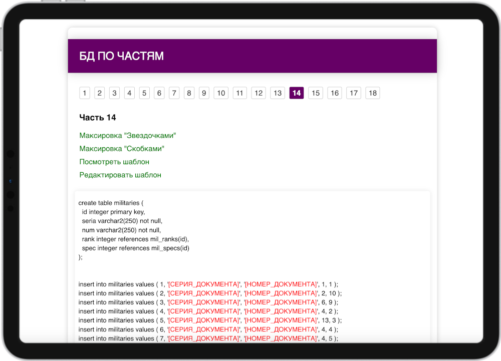 На этой странице вы можете просмотреть шаблон, по которому была проведена деперсонализация части базы данных. Это позволяет убедиться в корректности и соответствии маскированных данных исходным шаблонам.