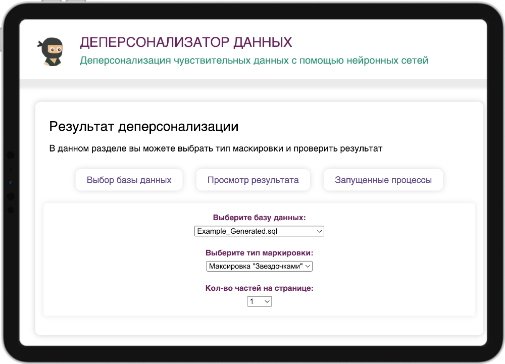 После того как вы завершили процесс деперсонализации данных и убедились в корректности результатов, нажмите кнопку "Экспортировать БД". Это позволит собрать все деперсонализированные части в единую базу данных и сохранить ее.