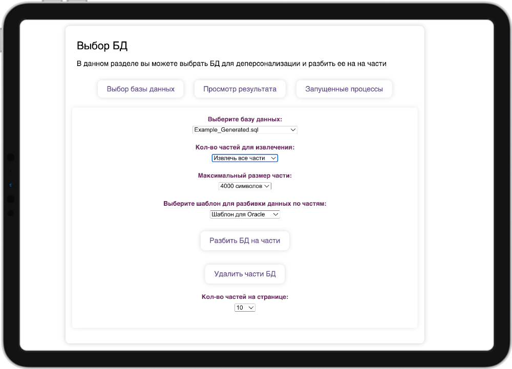 Программа поддерживает функцию "Умная разбивка базы данных по частям", которая позволяет разбивать большие базы данных на меньшие сегменты. Каждая часть содержит инструкции, включая заголовки таблицы, чтобы нейронная сеть могла понимать контекст каждого куска данных. Это обеспечивает точную и эффективную деперсонализацию данных, сохраняя целостность и контекст информации.